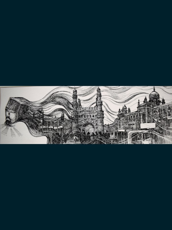 | Pen & Ink on Paper | Size: 21x5 Inches. Streetscapes of Hyderabad City in pen and ink on hand made paper. |